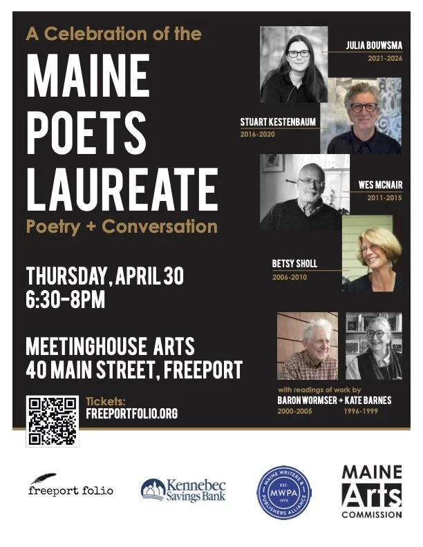 - A State of Maine National Poetry Grand Finale Event: a never-been-done-before reading by ALL of the Maine Poets Laureate to be held in Freeport. A partnership of Maine Arts Commission, the Maine Writers and Publishers Alliance and Freeport Folio.