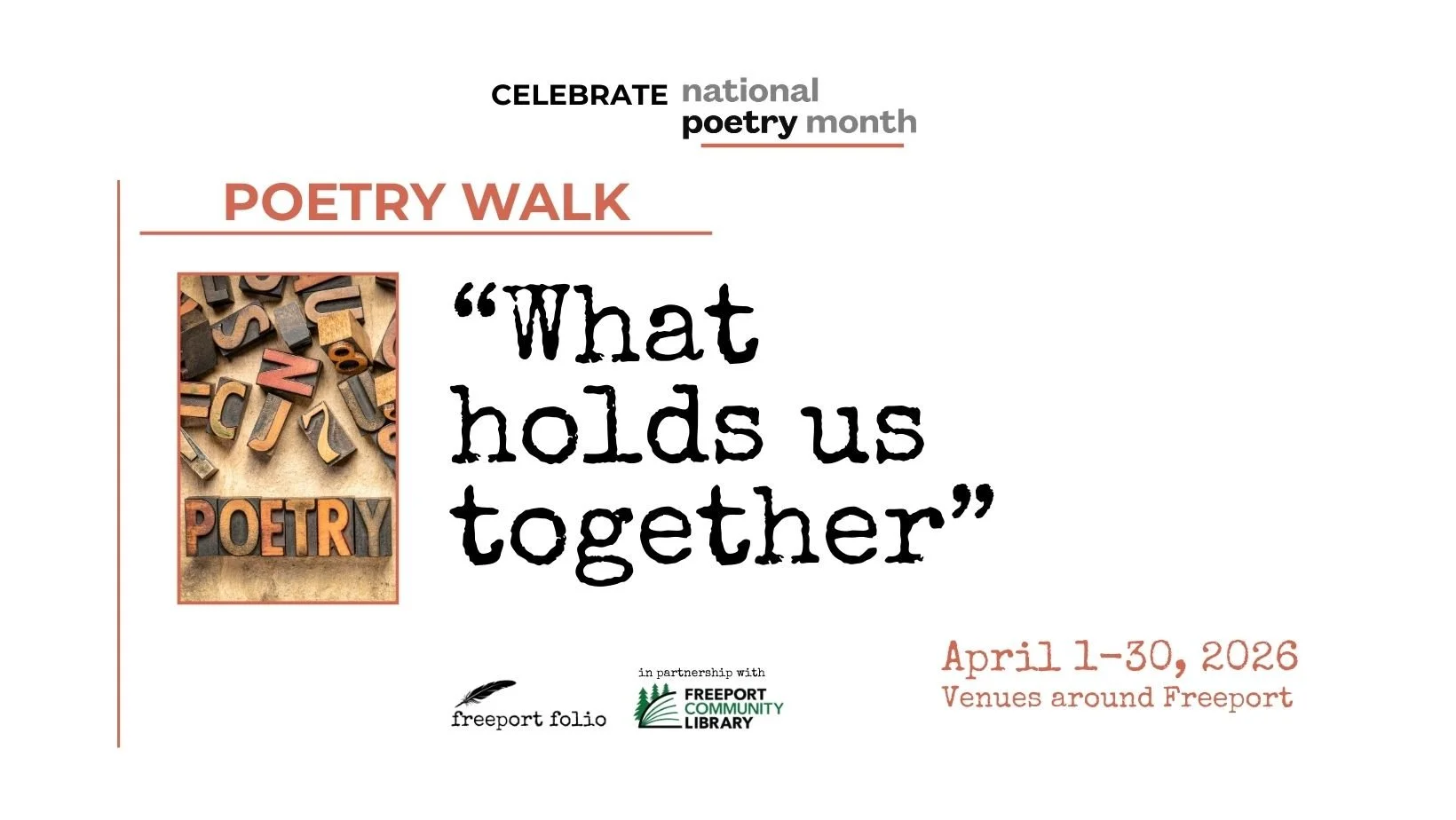 Stroll through downtown Freeport and encounter original poems by local writers displayed in storefronts and public spaces throughout April. Selected from the Freeport Community Poetry Competition, these works celebrate connection, place and shared belonging. Presented in partnership with the Freeport Community Library and Freeport Historical Society.